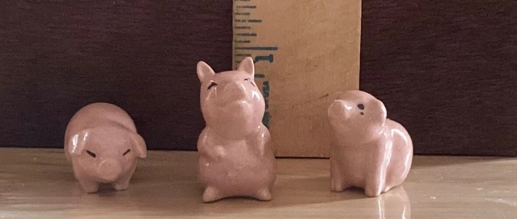 In my early twenties, I taught piano lessons to grade school students. (Who sometimes, seemed to enjoy the contents of my apartment more than the music lessons.) Once, my student, Patrick, came over and looked longingly at my house shaped shadow box that was on the living room wall adjacent to the piano. It had miniature furniture in it that I had picked up on clearance in the craft department where I worked at my day job. But Patrick was obsessed with my two tiny vintage glass pink pigs! One pig was so cute and was smiling.