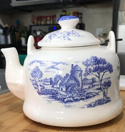 (Above) “This blue and white transfer ware decorative antique tea pot was among the things in my hope chest.”