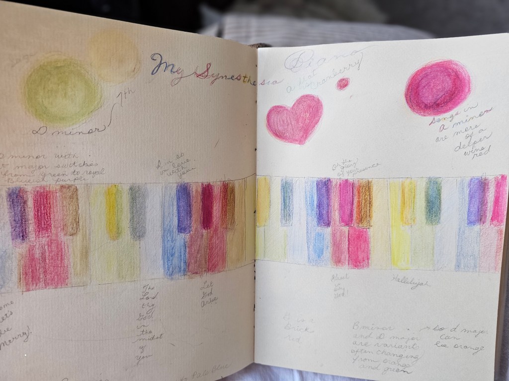 One day after church, I took a box of crayons after having drawn a simple blank piano keyboard. I began to fill in at random each note that I saw as a certain color. Very soon, it became clear to me that my perception of colors of the notes in music revealed themselves as a rainbow of color. Various shades blended into others.
